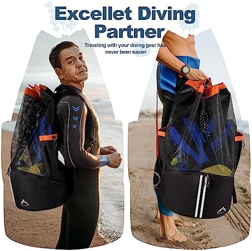 【Large Capacity & Keep Organized】- GoHimal scuba bag measured in 29”x16”x16”and equipped with multiple pockets to accommodate and organize all your scuba diving or snorkeling equipment like fins, goggles, mask, wetsuit, regulator, shoes, BCD, and more. 【Lightweight & Breathable Design】- Durable PVC coated mesh and bottom grommet allows to drain water easily and air dry quickly, ensuring that your gear stays dry and protected from potential damage caused by seawater and humidity. 【Delightful & Thoughtful Details】- Fluorescent strips making it easier for divers or their equipment to be spotted by others; adjustable chest and waist straps helps to relieve the stress of shoulder;built-in safety whistle in case of any emergency. 【Comfortable and Portable 】-This diving bag is designed in a backpack style, equipped with comfortable padded straps and back, allowing you to easily carry your gear during long-distance travels, providing a comfortable carrying experience. 【Durable and Long-lasting】- XL Scuba Diving Bag is constructed with high-quality materials, ensuring excellent durability and a long lifespan, capable of withstanding the demands of various diving and snorkeling activities.