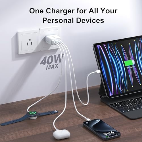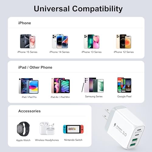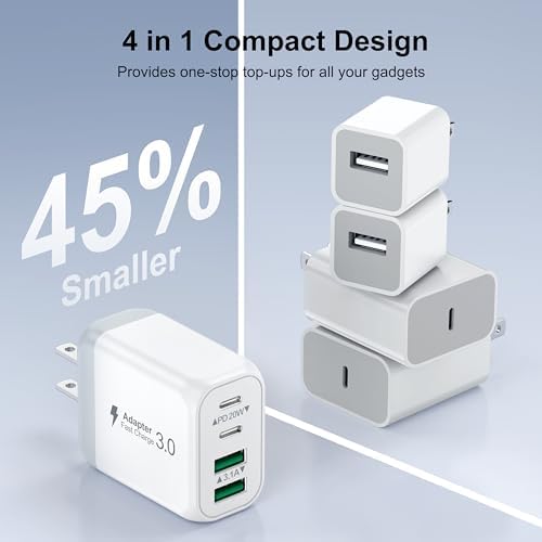 One for All: With totally 40W 4-Port designed (2*USB-C + 2*USB-A), allow users to simultaneously charge four devices. It can really save your time,best replacement for your original charger. High-Speed Charging: With QC+PD 3.0 port, offers fast and efficient charging up to 3X faster than a 5W charger. Charge your iPhone 14 up to 50% capacity in just 30 minutes with the original cable. Cable not included, only 2 Chargers. Universal Compatation: Designed for iPhone 11/12/13/14/15 Pro/12 Pro Max/iPhone 8 and later. The USB charging adapter is compatible for iPhone, iPad, iPod, smartphone, MP3 / MP4 players, play equipment, GPS devices, PC tablet, Google Nexus Tablet, Samsung Galaxy Tab and other digital devices compatible. Compact & Portable: Incredibly compact size for enhanced portability.All this power comes installed in a pocket-friendly compact body, to go wherever the journey takes you. Ideal for home, office and on the go. Safe & Reliable: Equipped with a smart chip, which can adjust the input power of the phone to prevent the phone from overcharging and overheating. What You Get: 2 X 40W 4Ports USB C Charger Block, and friendly customer services.