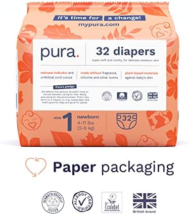 GOOD FOR BABIES: Totally Chlorine Free (TCF) Super soft and comfy, our diapers are enhanced with organic cotton, perfect for delicate newborn skin. With only plant-based materials against your baby’s bottom, our dermatologically tested, allergy-certified diapers are made without fragrance, chlorine bleaching, lotion, parabens, natural rubber latex and phthalates. PERFECT FOR NEWBORNS: Our diapers feature a special umbilical cord cut-out, contoured to protect the delicate belly area. They also feature a handy color-changing wetness indicator, so you know when it’s time for a diaper change! GOOD FOR THE PLANET: Pura’s EU EcoLabel accredited diapers are manufactured in a carbon neutral plant, powered by green electricity. Where possible, we’ve replaced non-sustainable materials with lower impact materials such as wood pulp from sustainably managed forests in the absorbent core of our diapers. Our packaging is made from paper, so it's easier to recycle! TRUSTED BY PARENTS: Made in the EU to the highest standards, Pura diapers have won multiple awards, voted for by real parents. USING BUSINESS FOR GOOD: Pura is a certified B-Corp and a Carbon Neutral business. #216 in Baby ( ) #16 in #236 in