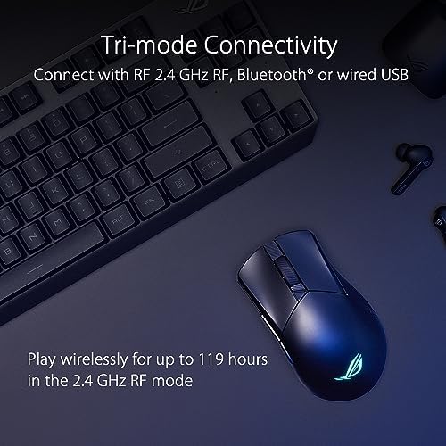The Ever-evolving Classic: An all-time favorite of ROG fans, the Gladius series continues to push through boundaries while retaining the essential characteristic that makes the series so unique – an asymmetrical shape that provides lasting comfort for a variety of right-handed grip styles. Great Precision: Track every movement with unrivaled precision with the ROG AimPoint optical sensor. Featuring sensitivity levels ranging from 100 to 36,000 dpi with industry-leading <1% cpi deviation, the sensor registers movement at speeds of up to 650 inches per second (ips) at up to 50 g acceleration to ensure that your movements are swift and effective. Tri-Mode Connectivity: Connect the Gladius III Wireless AimPoint any way you want: go with the ultrafast wireless 2.4 GHz RF mode, pair up to three devices with Bluetooth fast pairing technology, or fast-charge while dominating a game with the wired USB mode. Weight Reduction: This latest iteration of the Gladius series weighs just 79 grams – ensuring your movements remain sharp and controlled, even after hours of play. Energy-Efficient Performance: Game wirelessly for up to 119 hours in ultrafast 2.4 GHz RF. Or go on for up to 143 hours in Bluetooth mode.