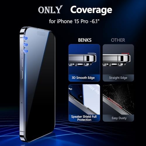 ❤【Compatible with iPhone 15 Pro 】This BENKS Anti-Spy protector is specifically designed for iPhone 15 Pro 6.1 inch 2023. High quality tempered glass raw material and built in Speaker Dust Cover, Covering the whole screen. Screen edges are also fully protected, Water-prood, Dustproof, Not easy to chip. So, it is very compatible with Face ID and Case Friendly. ❤【True 25°Anti-spy Protection】Unlike most privacy screen protectors, BENKS privacy screen protector adopts the latest anti-peeping technology, which brings a revolutionary 25° angle privacy protection (the smaller the viewing angle, the stronger the privacy protection). Allows you to provide the best 25° anti-spy viewing angle from the side in portrait mode, building a protective wall for your privacy for privacy-conscious users. ❤【High Protection】In daily use, the edges of the phone screen are often the most vulnerable place. We provide professional reinforcement to the edge to the edge for the iPhone 15 Pro screen protector. Double strengthened curing technology, not easy to crack. It protects your precious New iPhone from unwanted scratches caused by knives, keys and other hard objects in your pocket. ❤【Comfortable and Clean】With unique AR transparency enhancement technology, it effectively reduces black spots, keeps the screen clear and reduces discomfort when viewing the screen. And our screen protector is coated with hydrophobic and oleophobic transparent layers, making the screen smoother, fingerprint-resistant, easy-to-clean and waterproof. ❤【BENKS 1 to 1 Exclusive Service】Upgraded the liquid adhesive as well as the Auto-alignment Frame to make sure 100% install successful. Any bubble or anything, please feel free to contact us through Amazon's Message Center. We provide professional 24/7 quick-reply support. Customer satisfaction is our first goal!