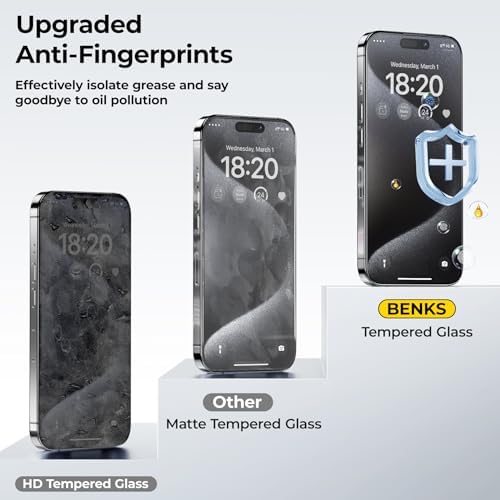 ?【Anti Galre Tech】:BENKS iPhone 15 pro max screen protector with a premium anti-glare matte finish that reduces harsh light reflections off your screen, making your phone easier to use under direct sunlight, or in brightly lit rooms, and is highly resistant to oil smudges and fingerprint marks. According to a survey, an average of more than eight hours per person per day is spent using a smartphone. To protect the eyes, anti galre matte films must be used! ?【Only 0.23mm, As your iPhone's 2nd Screen】The 0.23mm iphone 15 pro max matte screen protector glass is ultra-thin, just like without the protector, feels very smooth. And it is made of high-quality 9H tempered glass, with a 1:1 reinforced black border surrounding the most vulnerable screen edges, providing comprehensive protection for your new iPhone. Also, it is visually invisible as it blends perfectly with the iPhone screen. ?【High Definition & Face ID Recognition】BENKS New generation Matte screen protector provide our users with premium clarity and highly sensitive touch response. We use Nano technology to ensure that there is no graininess on the screen. Therefore, it will not blur the front camera and does not interfere with any functions. Your Face ID will work as well as normally as without a film. ?【Smooth Feel & Easy to Apply】The surface of this tempered glass film is micro matte finished and treated with an oleophobic coating, which provides you with the super smooth touch feeling and sensitive respond, while keeps your screen free of fingerprints, water and oily smudges. Also, Alignment frame and cleaning kit take the guesswork out of application to ensure it’s quick, easy, and bubble free ❤【What You Get】2x Matte Glass screen protector, 1x Auxiliary Cleaning Kit, 1x Easy Install Tool and friendly customer service. If you have any problems with the product, please contact us via Amazon. We will respond within 24 hours and provide a satisfactory after-sales experience. Note: This Matte glass screen protectr is specifically designed for iPhone 15 Pro Max 6.7inch 2023, ✳Not for any other models.