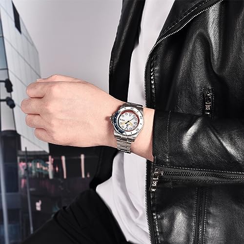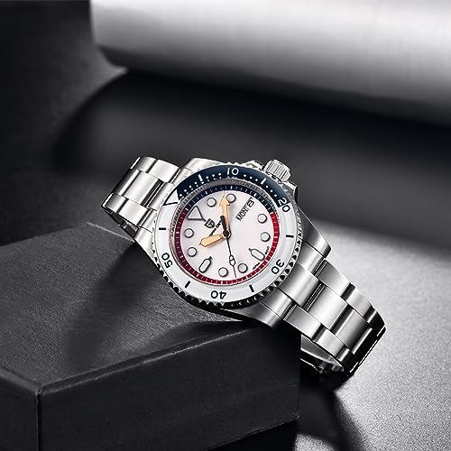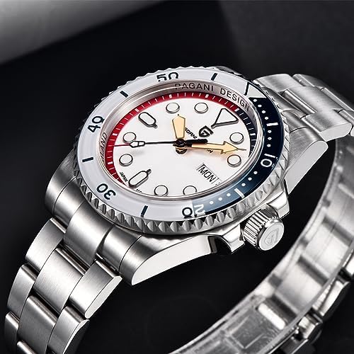 ♣Brand:Pagani Design Model:PD-1726 Movement: Japan NH36A[Automatic Machinery] ♣Case Material -316L Stainless Steel Case Thickness : 12MM Dial diameter: 40MM Bracelet length : 220MM Bracelet width : 20MM Note:This data is measured manually, there will be some errors ♣Glass: Synthetic sapphire glass Dial Color:White Pointer:SLNC3 Green light luminous coating Luminous:SLNC3 Green Light, Hands and Markers ♣Crown: Screw-in crown with 3D "PAGANI DESIGN" logo Bottom cover: screw-in transparent bottom cover Case Shape: Round Case Back: Screw-down Case Back Strap:Stainless steel ♣Watch functions:Impact resistant,Waterproof,Luminous,Calendar Water Resistant: 10 Bar=100 meters Weight: about 150g #3,344,788 in Clothing, Shoes & Jewelry ( ) #18,466 in
