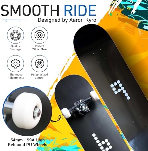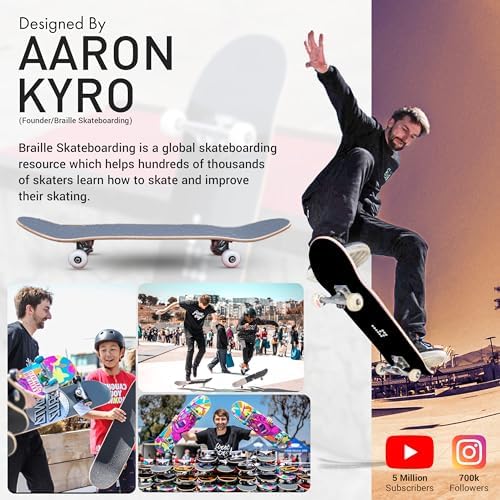 KICKSTART YOUR SKATE JOURNEY with Braille Skateboarding premium skateboards for kids, teens & adults featuring a double kick concave design + top grade grip tape for better control & handling, 54mm - 99A high rebound urethane wheels and fast ABEC 7 Bearings for quality & speed SUPERIOR MATERIALS These standard skateboards are made with the best materials for long-lasting durability & performance such as our 7 Ply 100% Canadian Hard Rock Maple decks for optimal strength & flexibility, allowing beginners to learn with confidence PERFECT FOR ALL AGES like Skateboards for kids ages 6-12, teens & adults, this Braille Skateboard comes in many colors, including a pink skateboard for girls. We recommend 8.0” width for anyone starting out or unsure of what size to get. It is a perfect middle-ground for people of all shapes & sizes, including small children IDEAL GIFT FOR SKATEBOARDS ENTHUSIASTS of all ages & skill levels. Need a beginner skateboard or one for advanced riders? This cool skateboard comes fully assembled & ready to ride, so your skater quickly builds confidence whether just learning or mastering advanced tricks. Suitable for cruising, street skating, parks, ramps, pools, smooth or rough ground OUR PURPOSE is to inspire, motivate & teach the world to skateboard. We believe anyone can skateboard regardless of age, color, body shape or size + want everyone to feel like they can progress on their board. You can be a great skateboarder! This is why we created the Braille line of products, community & online tutorials –We won’t stop until skateboarding is the most popular sport in the world!