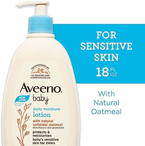 Twin pack of two, 18-fluid ounce bottles of Aveeno Baby Daily Moisture Body Lotion with natural colloidal oatmeal, dimethicone and rich emollients features a naturally nourishing formula that moisturizes for a full 24 hours From a pediatrician- and dermatologist-recommended brand, this baby moisturizing lotion is specially formulated to be gentle enough for babies' delicate skin Formulated with natural colloidal oatmeal and dimethicone skin protectant, this oatmeal baby lotion helps prevent and protect dry skin and is gentle enough for everyday use Hypoallergenic baby lotion is non-greasy and free of fragrance, parabens, steroids, phenoxyethanol, and phthalates so it won't irritate your little one's sensitive skin This daily baby lotion is naturally nourishing and provides relief from chafed, chapped or cracked skin so your baby's delicate skin is protected and moisturized #181 in Baby ( ) #3 in