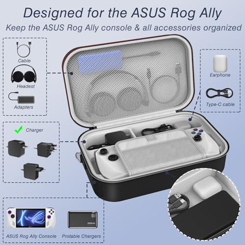 HSTOP ROG Ally Case for ASUS ROG Ally, Carrying Case for ROG Ally Console & All Accessories, Large Capacity Travel Case Built-in AC Adapter Charger Storage, Black