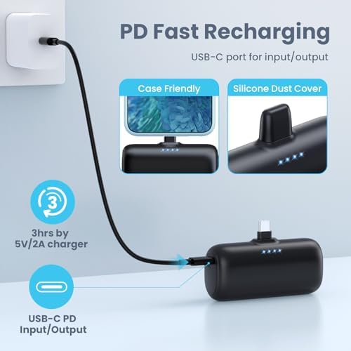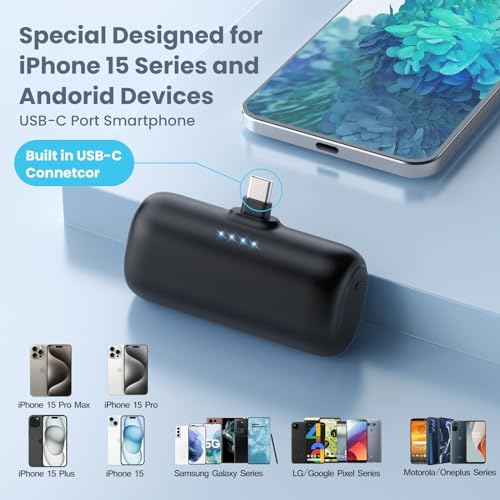 【Mini Size Plug-in Portable Charger for Android】Size of a lipstick, built-in Android USB C interface, no need a cord. Ultra Compact design with 5200mAh powerful capacity battery power bank,make it easy for you to handle various charging scenarios. 【Built in USB-C/Type-C Connector】This small USB-C portable power bank Compatible with iPhone 15 series(iPhone 15/15pro/15plus/15pro max) and all Android cellphones, such as Samsung Galaxy,Pixel,LG,Oneplus,Moto,Google and other USB-C devices. 【PD Fast Recharging Battery Bank】PD USB C port supports both input and output that this external battery backup can charge any devices or recharge itself at 3A high charging speed.4 LED power level indicators display battery level(25%-50%-75%-100%), allowing you to know the status of the mini portable power bank. 【2023 High Quality Small Power Bank】Plug in battery bank built in longer connector, supports most cellphones cases(<4.5mm).Upgrade antioxidant process plug for longer service life.Supports pass-through function that you can charge your Samsung Android phone while charging the battery pack. 【Multiple Safety Protection】This cute Type-C interface power bank built-in intelligent chip can protect your devices against over-discharge, over-charge, short-circuit or overheating. 【You will Get】1 x Mini Portable Charger Power Bank, 1 x USB C Cable, 1 x User Manual. 24-Month replacement guarantee and 180-days full refund warranty. Any questions, please kindly contact us anytime.