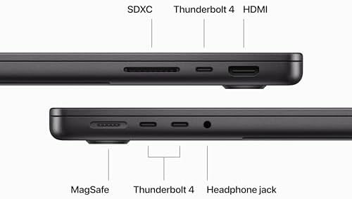 SUPERCHARGED BY M3 PRO OR M3 MAX — The Apple M3 Pro chip, with an up to 12-core CPU and up to 18-core GPU, delivers amazing performance for demanding workflows like manipulating gigapixel panoramas or compiling millions of lines of code. M3 Max, with an up to 16-core CPU and up to 40-core GPU, drives extreme performance for the most advanced workflows like rendering intricate 3D content or developing transformer models with billions of parameters. UP TO 18 HOURS OF BATTERY LIFE — Go all day thanks to the power-efficient design of Apple silicon. The MacBook Pro laptop delivers the same exceptional performance whether it’s running on battery or plugged in. (Battery life varies by use and configuration. See apple.com/batteries for more information.) BRILLIANT PRO DISPLAY — The 14.2-inch Liquid Retina XDR display features Extreme Dynamic Range, over 1000 nits of brightness for stunning HDR content, up to 600 nits of brightness for SDR content, and pro reference modes for doing your best work on the go. (The display has rounded corners at the top. When measured diagonally, the screen is 14.2 inches. Actual viewable area is less.) FULLY COMPATIBLE — All your pro apps run lightning fast — including Adobe Creative Cloud, Apple Xcode, Microsoft 365, SideFX Houdini, MathWorks MATLAB, Medivis SurgicalAR, and many of your favorite iPhone and iPad apps. And with macOS, work and play on your Mac are even more powerful. Elevate your presence on video calls. Access information in all-new ways. And discover even more ways to personalize your Mac. (Apps are available on the App Store.) ADVANCED CAMERA AND AUDIO — Look sharp and sound great with a 1080p FaceTime HD camera, a studio-quality three-mic array, and a six-speaker sound system with Spatial Audio. CONNECT IT ALL — This MacBook Pro features a MagSafe charging port, three Thunderbolt 4 ports, an SDXC card slot, an HDMI port, and a headphone jack. Enjoy fast wireless connectivity with Wi-Fi 6E and Bluetooth 5.3. And you can connect up to two external displays with M3 Pro, or up to four with M3 Max. (Wi‑Fi 6E available in countries and regions where supported.) MAGIC KEYBOARD WITH TOUCH ID — The backlit Magic Keyboard has a full-height function key row and Touch ID, which gives you a fast, easy, secure way to unlock your laptop and sign in to apps and sites.
