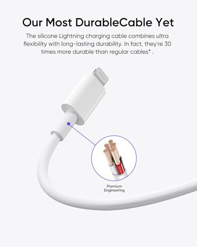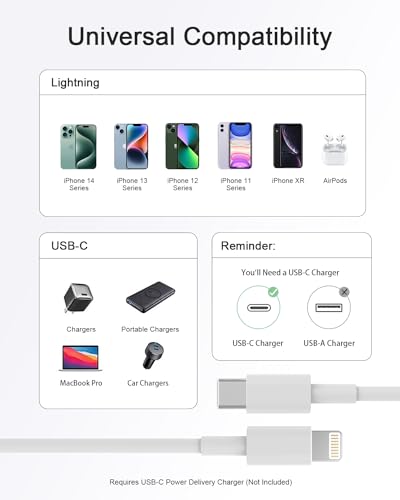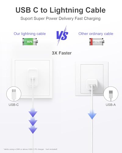 ⚡【Supports High-Speed Charging】Power up your iPhone to 50% in just 30 minutes when you use an 18W or higher Power Delivery USB-C charger,which saves more than 1 hour for you, when compared to the 5W original charger. ⚡【MFi Certified】 Apple MFi Certified USB to Lightning cable, guaranteed no pop-up warnings, these iPhone fast charging cables use advanced C94 Lightning end design for fast charging, which can safely and quickly charge your iPhone device. ⚡【Superior Durability and Strong Quality】High quality TPE material makes this cable more durable and stronger than ordinary iPhone charger cables, while remaining flexible and tangle-free. It is tested for up to 30,000+ bends, making it more durable. Withstand all kinds of daily connection needs and long-term use. ⚡【Wide Compatibility】: MFi certified for flawless compatibility with all Lightning devices, including iPhone, iPad, and more.Works With for iPhone14/13/13 Mini/13 Pro/12/12Pro/12 Pro Max/12 Mini/11/11 Pro/11 Pro Max/XS Max/XS/X/XR/8 Plus/8, iPad Pro/ iPad Air/ iPad, AirPods Pro. Standrad Charging Speed works with iPhone 7/7 Plus/6s/6s Plus/6/6 Plus/SE/5s. ☎【A Cable for Life】We’re so confident in our cables, we are offering a hassle-free replacement for all quality issues. Not for half a year, not for 18 months, but for an entire lifetime. It’s the only cable you will ever need to buy.USB C to Lightning Cable 6 feet long, convenient to charge your device in bedroom, sofa, office, travelling, even if you are in the back seat of the car. #63 in