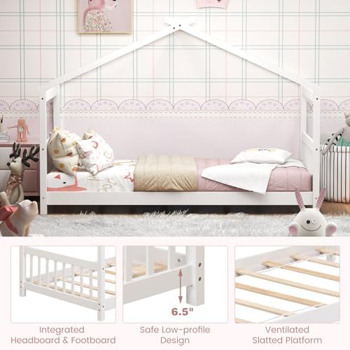 Fun & Playful Design: The charming house-shaped bed frame will inspire your child’s imagination and make bedtime more enjoyable. You can decorate the roof with pennant banners or other ornaments, making it the focal point of any kid’s bedroom. Safe Floor Bed: The twin bed for kids features a low-bed design, ensuring a safe and secure sleeping environment. You can have peace of mind knowing that your child can easily get in and out of bed without the risk of falling. Built with Solid Wood: The floor bed for kids is built with high-quality solid wood to ensure durability and stability. Plus, the sturdy plywood slats form a ventilated and supportive surface for mattress, no box spring required! Spark Their Creativity: The platform bed offers not only a comfortable place to sleep but also a world of imagination. Your child will love playing, reading, and dreaming in their own little house, making bedtime an adventure every night. Easy Assembly & Maintenance: With straightforward assembly instructions, you can quickly set up this twin house bed without any hassle. Its low maintenance design allows for easy cleaning and upkeep, making it convenient for busy parents.