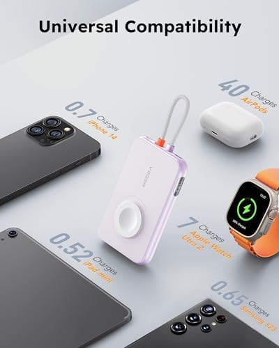 ✔️【Special Designed for Apple Family】: Built-in cable for iPhone, a magnetic module for Apple Watch, and a Type C port output for iPhone 15 series, the portable charger will power your iPhone, Apple Watch, and Airpods simultaneously. ✔️【PD 20W Fast Charging】: The built-in cable supports PD 20W fast charging, providing your iPhone with 60% juice in 30 minutes, 3 times faster than normal 5V 1A charger. ✔️【Compatibility】: This portable battery charger is widely compatible with iPhone 15/14/13/12/Pro Max series, Apple Watch 9/8/7/6/5/4/3/2/1/SE/Ultra, as well as other Type C Android devices or tablets. ✔️【5000mAh Battery with Slim Body】: With a slim size of 4*2.4*0.6 inches, the external battery is a perfect travel accessory. 5000mAh capacity is emergenced for daily used, providing 0.7 charges for iPhone15/14, 7 charges for Apple Watch Ultra, 0.52 Charges for iPad mini 6, 40 charges for Airpods, 0.65 charges for Samsung S23. ✔️【What You will Get】: A VEGER 5000mAh portable charger with built in cable, 1x user manual, 1x USB C cable, our worry-free 12 month guarantee and 7 Day/24H friendly customer service. If you have any problems, please contact us and we will solve it within 12 hours. ✔️【Friendly Reminder】When charging your Apple Watch, kindly press the button and wait 5-16 seconds for the wireless charging to activate.