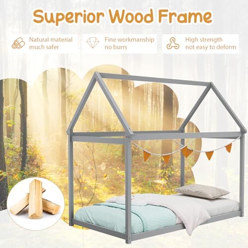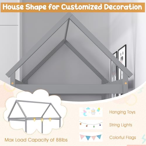 [Unique House Bed Shape]: Our twin house bed frame features a charming, Montessori-inspired house shape design that adds a touch of whimsy and imagination to any child’s bedroom. You can hang curtains, lights or other ornaments to make the house bed look even more fancy and attractive. [Great Transition for Kids]: The floor tent bed will be a good transition from kids to normal bed for young age kids. The low to ground height makes it easy for kids to get in or off the bed, helping them cultivating independence and confidence. [Premium Wooden Frame]: Made from high-quality solid wood and sturdy plywood, this twin bed frame is built to last, providing a long-lasting sleeping environment for your child. The smoothly-polished surface is burr-free for a safe touch. [Versatile Use]: The platform bed with canopy is not only a cozy place to sleep, but also a versatile piece of furniture that can be used as a reading nook, play space, or even a fort. It is a good choice for both boys and girls. [Easy Assembly]: With clear instructions and all necessary hardware included, setting up this toddler bed is a breeze, saving you time and effort. It can accommodate a 6-inch twin size mattress directly. No box spring is required!