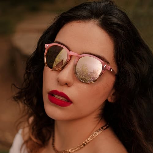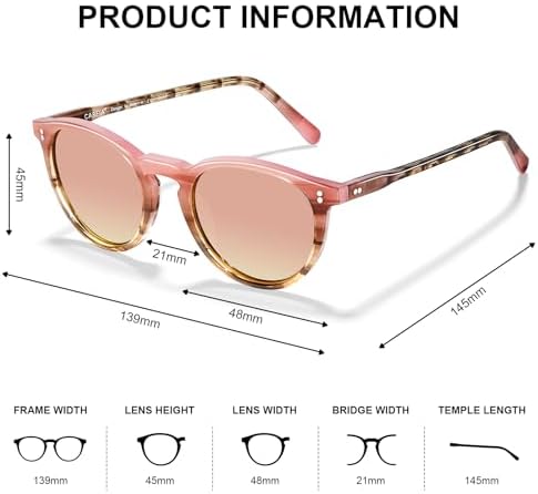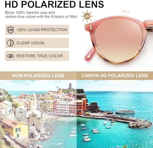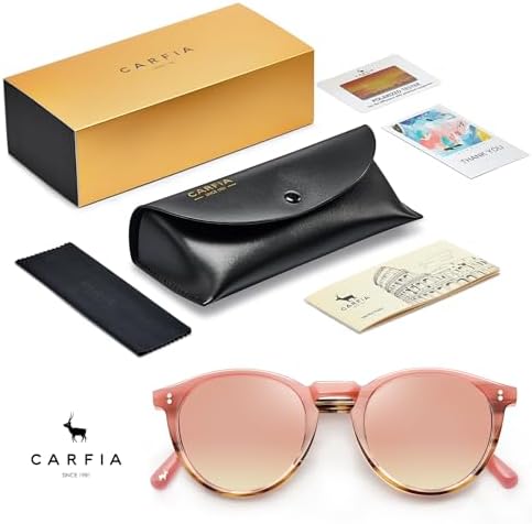 HYPOALLERGENIC MATERIALS - CARFIA sunglasses are made with acetate frames that have a translucent frame. Acetate is a hypoallergenic, plant-based plastic that is safe for people with sensitive skin. POLARIZED LENSES - CARFIA Polarized sunglasses are the result of 30 years of innovation and research, blocking over 99% of reflected light. Polarized lenses can reduce glare and starlight caused by oncoming vehicles, and also help alleviate eye fatigue. UNIQUE DESIGN - Designed in a retro-inspired style, these lock-hole round sunglasses combine minimalist style with everyday comfort, making them a great choice for all-season outfits. COMFORTABLE TO WEAR - These sunglasses are comfortable and easy to wear, with no constriction or squeezing on the sides of the nose and ears, ensuring that they stay on, even during strenuous exercise. WELL-DESIGNED GIFT PACKAGING - 【Classic Round Women Sunglasses】【Velvet-lined Leather Case Reinforced Inside】【Soft Lenses Wipe】【Polarization Testing Card】【Product Manual】【100% Satisfaction Guarantee and 1 Year Warranty】