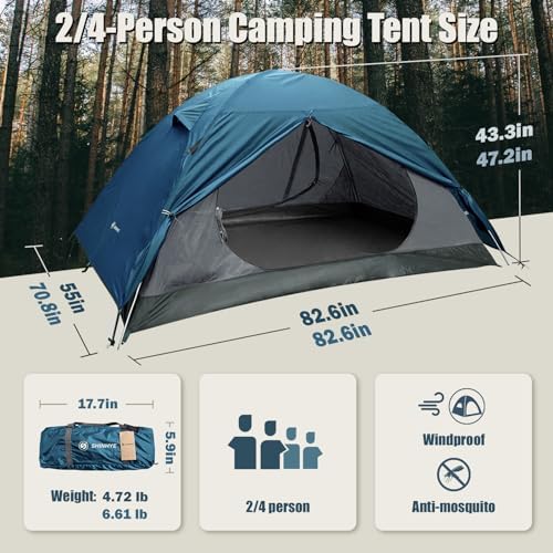 【High Quality Fabric】ShinHye Camping Tent materials are made of high-grade materials,190T polyester fibre + 210D Oxford fabric + B3 net,Fine workmanship,adopt ShinHye waterproof technology to seal seams,equiped rain fly to cover on top of tent,double layer Increase waterproof performance 【Unique Design】ShinHye Camping Tent is designed in 2 sizes, 2-person tent and 4-person tent, with a variety of sizes to choose from ,spacious and comfortable movement,suitable for couples and family outings. 【Quick Setup】Very fast to pop up and take down,The two aluminum poles make the lightweight mountaineering tent quick and easy to set up, even for one person.Packed Size: 16.9''x5.9''x5.9'', easy to put in one’s backpack. 【Ventilation design】2 large door for enhanced airflow and open view,The inner gauze net will protect you from bite in summer,Tent comes with alloy hooks and windbreaks,so it can be used firmly on windy days. 【Multi-functional】ShinHye Camping Tent with a double-layer design, the tent is the first choice for hiking, family outings, fishing, mountain camping, car camping, backpacking or biking.