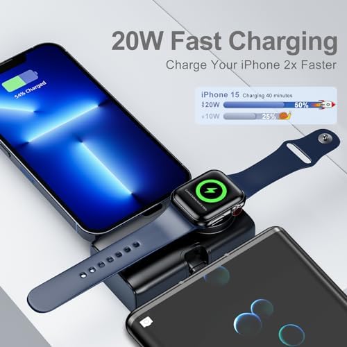 ✔️Pocket-Sized Power: Equipped with a built-in LT and Type C port connector,compatible with Apple Watch Series making it easy to charge your Apple devices without having to carry an extra cable. ✔️Portable Travel Charger:Compact and lightweight , you can easily put this portable charger in your pocket or hang it on your backpack, which is a great travel companion.Equipped with a holder, it can stabilize your iPhone, providing added convenience for various scenarios. ✔️Compatibility Charge Multiple Devices :This portable battery charger is widely compatible with iPhone 15/14/13/12/Pro Max series, Apple Watch 9/8/7/6/5/4/3/2/1/SE/Ultra, as well as other Type C Android devices or tablets. ✔️PD 20W Fast Charging : The built-in cable supports PD 20W fast charging, providing your iPhone with 60% juice in 30 minutes,Power your device quickly and efficiently. ✔️Superior Safety Features: Portable charger battery pack has built-in over temperature, over current, over voltage and short circuit protection to ensure you use the product safely.