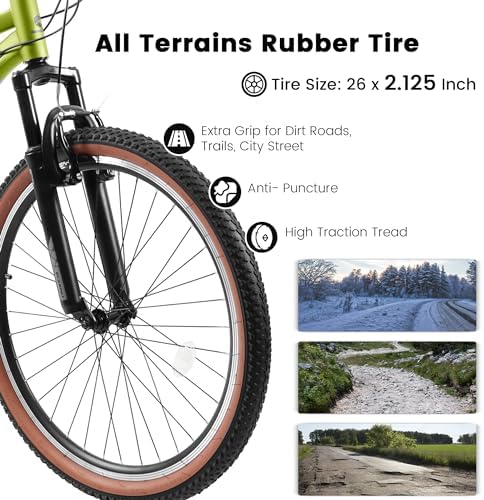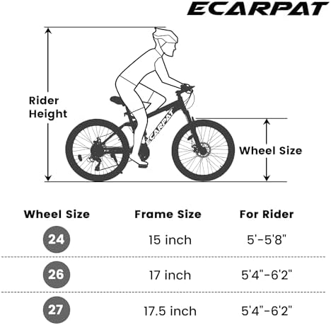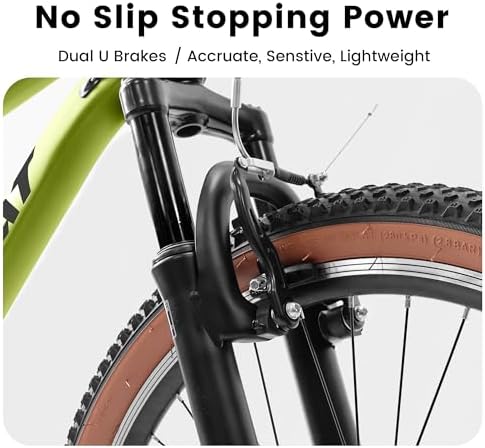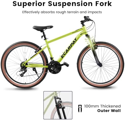 【Durable Steel Frame】Sturdy and durable 24-inch wheel x 15-inch frame, provides a safe and stable cycling experience. Ergonomically designed, suitable for men and women height 5'0"-5'8". 【21-Speed with Disc Brakes】Trigger shifter helps to switch gears with smoothness. Simple operation allows for a quick selection of gears for various terrains. Mechanical dual Disc brake system, simple structure, and convenient for maintenance. 【Front Fork Shock Absorbing Design】Feature 100mm front suspension fork. The thickened fork helps resist and absorb shocks. The parallel bars can adapt to pressure road conditions. Greatly improves the comfort during riding and allows you to enjoy riding. 【24*2.125" All-Terrain Tires】Made of high-quality rubber, all-terrain tires with strong puncture resistance soften the bumps and stick to the Dirt, Trail, Gravel, and Paved Path for a smooth, stable ride: strong grip, have a super excellent anti-skid function and is not easy to slip. 【85% Pre-Assembled】The bike comes 85% pre-assembled. You need to assemble the handlebar, saddle, front wheel, and pedals. After a short adjustment of the brakes and gears, you can start riding immediately. Please note that if you have any questions, you can contact our customer service first.