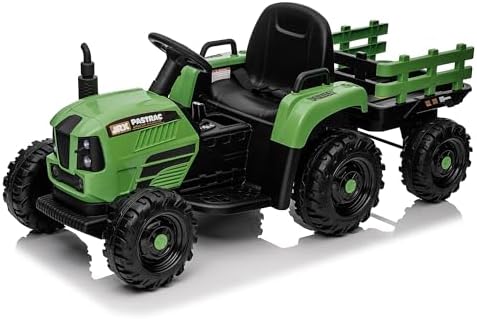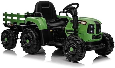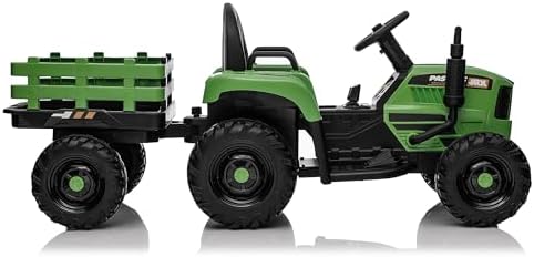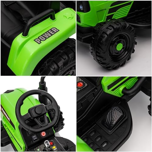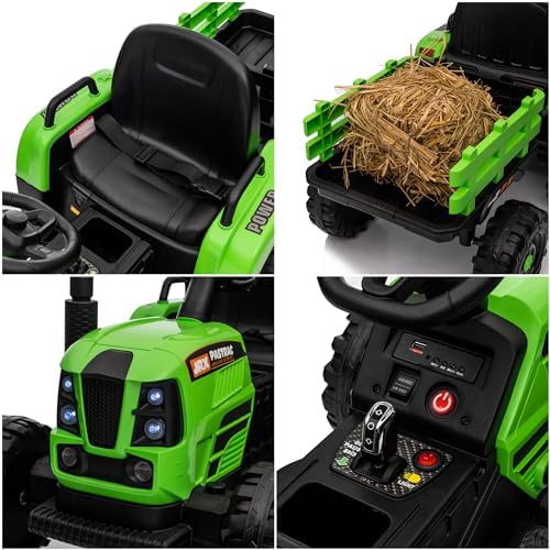 Ride on Tractor w/Trailer, 12v Battery-Powered Toy Tractor w/Remote Control and 3 Speed Adjustable, Electric Car for Kids w/Power Display, USB, LED Lights, Audio, Safety Belt, Army Green