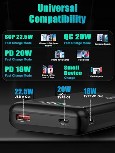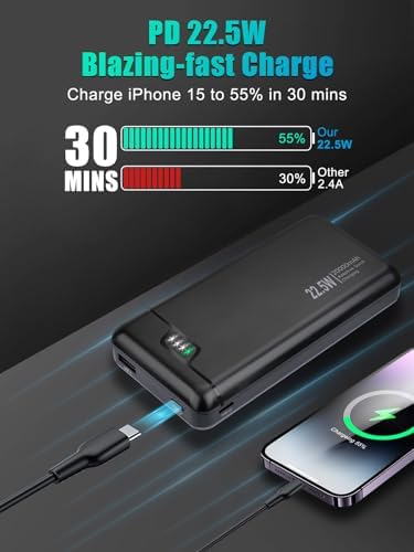 【From YPWA--22.5W SAFE Fast Charge Pross】20000mAh Real capacity,adopts advanced intelligent controlling IC and Highest level flame retardant material,including overcharge, overcurrent, and short-circuit protection.Welcome to try a safe charging trip with us! 【Charge Your Phone up to 55% in 30 Mins】With the upgraded 22.5W output plus the latest fast-charge technologies, your phone can be charged at 55% in just 30 minutes. 【Charge Your Pad up to 30% in 30 Mins】Most power banks in the market cannot charge your Pad or charge at a snail’s pace. However, YPWA with 22.5W high-speed output can charge all the existing Pad even the newest one at FULL speed. 【2024 Version USB C Input & Output】Unlike most chargers featuring a USB C input only, Our 22.5W has a USB-C In & Out port to perfectly fit your new iPhones, iPad and all upcoming USB-C devices. 【Charge Three at Once & Omnipotent Compatibility】With Two USB-C port and one USB ports built-in, it can juice up THREE devices simultaneously. Compatible with iPhone 15/15 Plus/15 Pro/15 Pro Max/iPhone14/13/12/11/Samsung Galaxy/Google Pixel and more Android phones/laptop and other multiple electronic devices. 【Charge Small Devices, Too】Unlike most power banks incapable of charging low-current devices, Can work with not only all the phones, tablets but your smaller devices like AirPods, Bluetooth headphones, fitness trackers, smart watches, etc. 【What You Get】YPWA 20000mAh power bank*1, USB C cable*1, welcome guide*1, 30-day money back, industry-leading 1-year warranty, plus lifetime technical support.