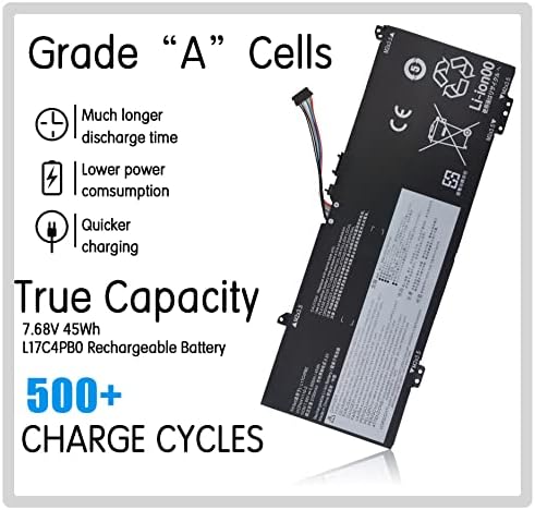 L17C4PB0 Replacement Lenovo Laptop Battery, Replacement Lenovo IdealPad Flex 6-14IKB Laptop Battery for Lenovo Flex 6-14IKB 6-14IKB-81EM, Flex 6-14ARR 6-14ARR-81HA, IdeaPad 530S 530S-14ARR 530S-14IKB 530S-15IKB 530S-14ARR-81H1 530S-14IKB-81EU 530S-15IKB-81EV, Yoga 530 530-14ARR 530-14IKB 530-14ARR-81H9 530-14IKB-81FQ 530-14IKB-81EK, XiaoXin Air 14IKBR, XiaoXin Air 14IWL, XiaoXin Air 15IKBR, XiaoXin Air 15ARR, XiaoXin Air 15IWL series. Replacement Lenovo Laptop Battery Compatible with L17C4PB0 L17M4PB0 L17C4PB2 L17M4PB2 5B10Q16066 5B10Q16067 5B10Q22882 5B10Q22883 2ICP4/41/110-2 3ICP4/41/110. Battery: L17C4PB0 / Type: Li-ion / Voltage: 7.68V / Capacity: 45Wh 5928mAh 100% New from Manufacturer. Overcharge and Overdischarge Circuit Protection;Over-temperature and Short-circuit Protection; Up to 500 recharge cycles over the life of your laptop. 90 days money back guarantee, 12 months Warranty, 24 x 7 Email Support.
