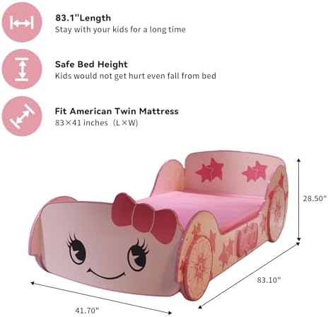 ?【Creative Children's Racing Bed】This bed with an appealing lovely pinky star car design and Wheels decoration will be a real eye-catcher in your bedroom. This unique twin bed creates a fun and lovely space that can be used not only as a cosy sleeping area but also as a play space. ⭐【Kid-Friendly Design】The Little Star Cartoon Car Bed is designed with rails on both sides to prevent your child from falling out of bed. Full coverage round frame to avoid child injury. Comfortable,functional,and aesthetically pleasing, this twin bed is designed to ensure the utmost comfort and maximum safety for you. ?【Solid and Safe】Made from premium P2 MDF, this bed is safe and odor-free, ensuring stability and durability. Sturdy slats provide the required support and can withstand daily wear and tear. ?【No Box Spring Needed】The kids bed frame with 13 wood slats support platform to extend the life of your mattress, suitable for all kinds of mattresses, spring, memory foam, latex, or hybrid mattress. ?【Easy Assembly】Easy-to-understand instructions are included for you to finish the assembly conveniently. All installation tools and accessories are in small bags. You don't need to prepare additional tools. If you have any questions about the product, please feel free to contact us. ?【PLEASE NOTE】This product is only a bed frame and does not include mattresses and sheets. Please be aware.